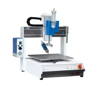 This is an industrial 2600cc fluid, adhesive dispensing machine. The machine pairs with a 2600cc material feeding tank, and a suck-back valve. It is suitable for low to medium viscosity fluids or adhesives dispensing, such as silicone, RTV, and other similar materials. This is professional, heavy-duty industrial adhesive fluid, glue automated desktop dispensing machine.