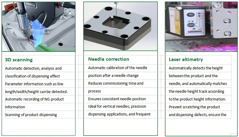 ● Powerful industrial PC platform multi-functional dispensing system, expandable multi-axis rotary dispensing, variable position dispensing, to realize multi-angle,all-round dispensing application.