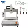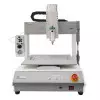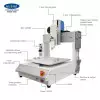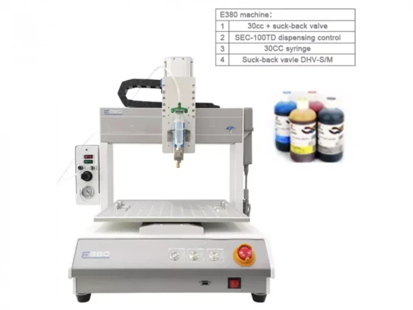 This is an industrial 30cc syringe fluid, adhesive dispensing machine. It works with one-piece aluminum casted Cartesian robot body, it is strong structure and stable operation. The robot has compacted, but with bigger working range, 380x380x100mm XYZ. It is also flexible to work and match with different glue filling systems, from 5cc syringe, 300cc cartridge, 1 gallons, 5 gallons, and so on. With this design, it is truly realize the dispensing of different adhesives materials for different products. This is professional, heavy-duty industrial adhesive fluid, glue automated desktop dispensing machine.