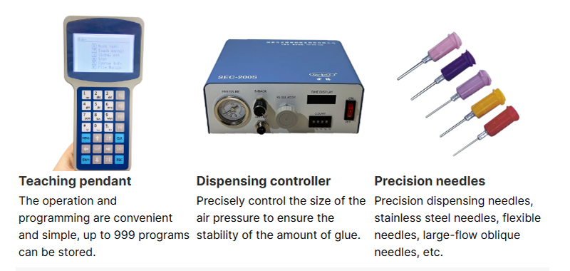 Dispensing equipment are important for various EMS (electronic manufacturing service) productions. Electronic product processing service industry is indispensable to modern life, because many products are now equips with electronic and become more intelligent. These products are becoming more and more complex, precise and tiny in size. And for consumer product, their production volume also in large production and fast turnover. Therefore, it is necessary to use automated equipment, or even fully automated production lines to produce to meet apply the materials. With the automatic dispensing robots, it is possible to catch up with the capacity and demands. And more importantly, to improve economic efficiency to maximize economic of scale, and so to reduce unit prices to enhance competition. Very often in this type of production, the uses of dispensing machines or equipment is inseparable. In this production process, the glue dispenser is usually used to assist in the functions of fixing, connecting, protecting, dissipating heat and so on between parts and components. Our glue dispensers can directly add the relevant materials to the specified positions accurately and quickly as required.