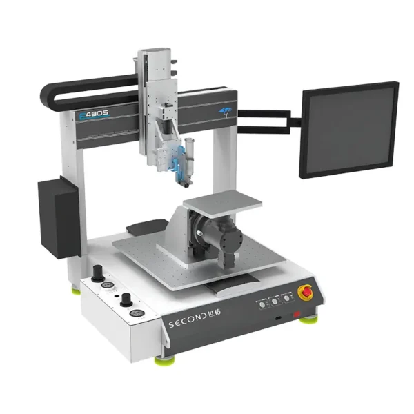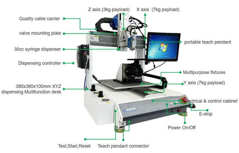 This is an industrial 30cc syringe fluid, adhesive dispensing machine. It works with one-piece aluminum casted Cartesian robot body, it is strong structure and stable operation. The robot has compacted, but with bigger working range, 380x380x100mm XYZ. It is also flexible to work and match with different glue filling systems, from 5cc syringe, 300cc cartridge, 1 gallons, 5 gallons, and so on. With this design, it is truly realize the dispensing of different adhesives materials for different products. This is professional, heavy-duty industrial adhesive fluid, glue automated desktop dispensing machine.