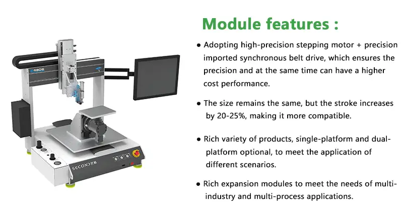 The platform has more advanced and powerful functions, which can be equipped with functions such as visual positioning, automatic calibration, glue dispensing detection, laser height measurement and compensation, product information scanning, MES system docking, etc., to meet the use of various industries and multiple scenarios