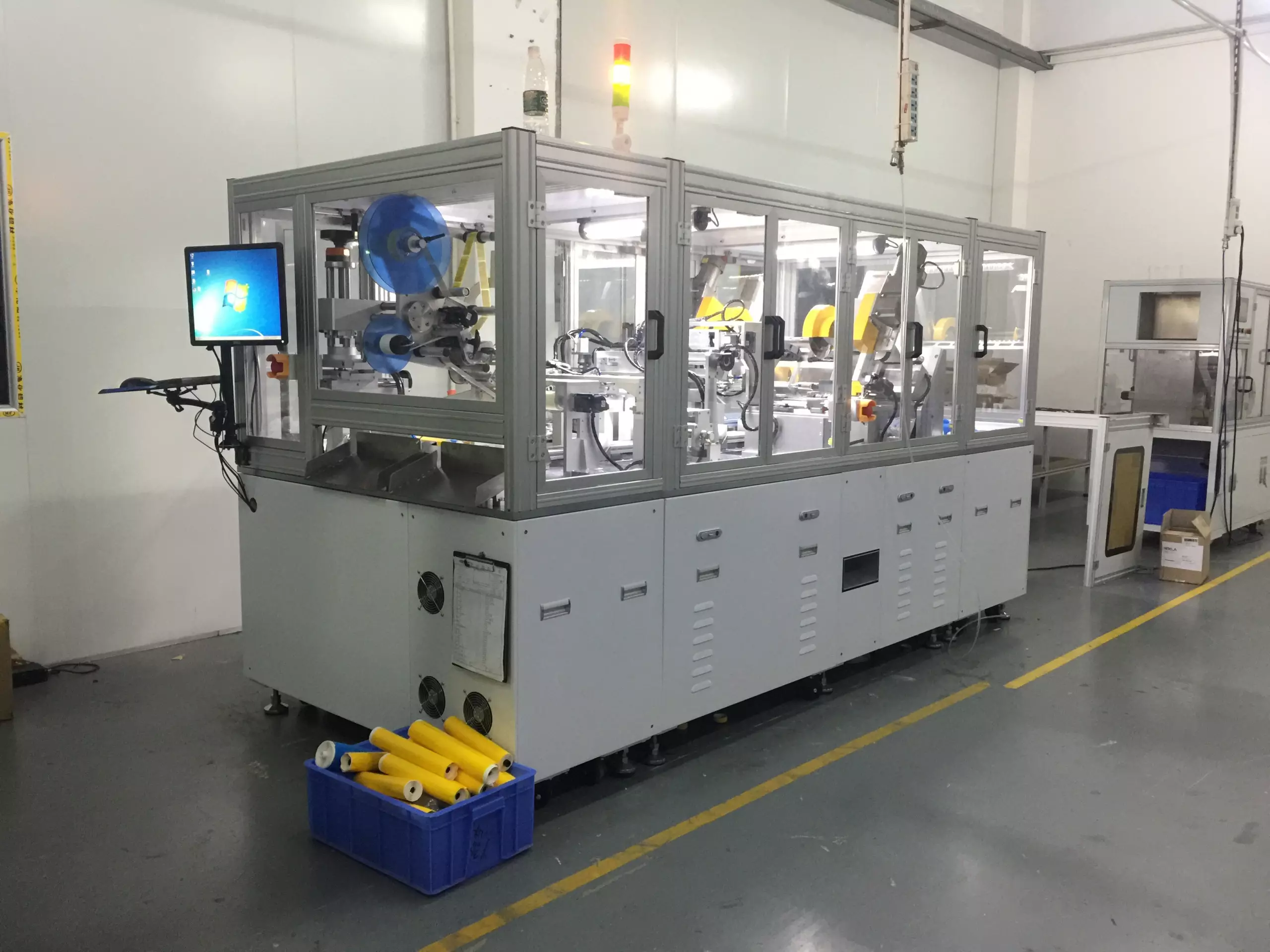 With this machine, operator can load about 100 units of spiral-wind cartridges on to its material bin, and the machine will automatic feeding cartridge to its place one by one. It will start to do edges trimming, edges pulling, adding O-rings, air-tightness detection, labeling and record barcode, and automatic unloading. This is a Smart-machine, it will automatically sort out the air-test failed cartridge and drop it to a separated bin.