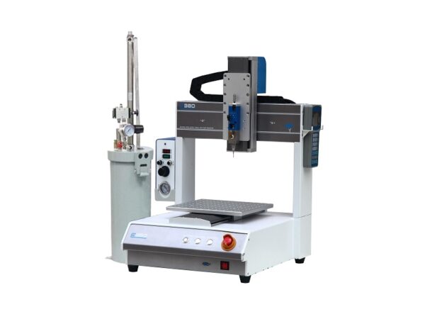 This is an industrial 2600cc fluid, adhesive dispensing machine. The machine pairs with a 2600cc material feeding tank, and a suck-back valve. It is suitable for low to medium viscosity fluids or adhesives dispensing, such as silicone, RTV, and other similar materials. This is professional, heavy-duty industrial adhesive fluid, glue automated desktop dispensing machine.
