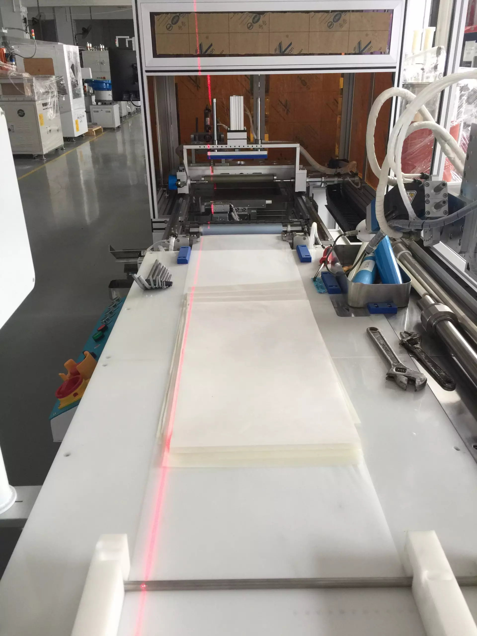 The equipment is suitable for fixed-length cutting of membranes, spacer, carrier membrane, etc. in the household RO cartridge element production process. It can cut products with a width of 150-1100mm. It is designed for high speed, high accuracy, and high capacity production.