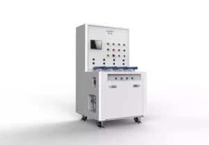 This is semi-automatic industrial reverse osmosis (RO) cartridge element rolling, it can roll SWRO, BWRO, 4040-8040 sizes of elements. It will need two people to operate at the same time. It is MMI type of machine, in the man-machine interaction area there’s safety light curtain installed for good protection. The machine comes with rolling table, adhesive dispensing, winding, ultra-sonic welding, and outer taping system, all in one. It is for mass production, and good for quick-change over to produce different sizes of the elements compare to the full-automatic machine.