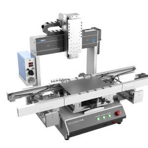 Smart high precision automated adhesive material dispensing machine with inline conveying system.