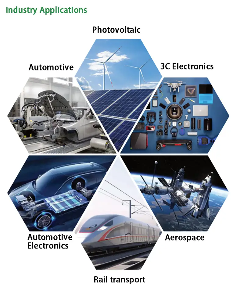 3C electronics, EV batteries, LED packaging, solar panels, and biomedical devices.