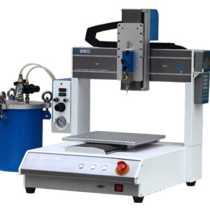 This is an industrial 1.5 gallons fluid, adhesive dispensing machine. The machine pairs with a 1.5 gallons material feeding tank, and a suck-back valve. It is suitable for low to medium viscosity fluids or adhesives dispensing. This is professional, heavy-duty industrial adhesive fluid, glue automated desktop dispensing machine.