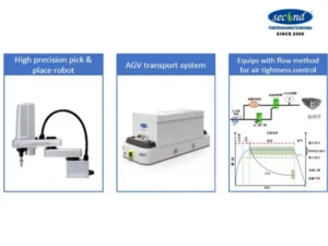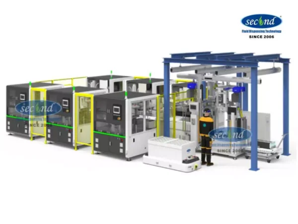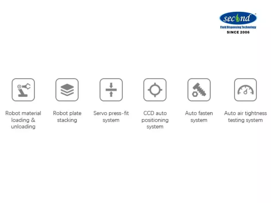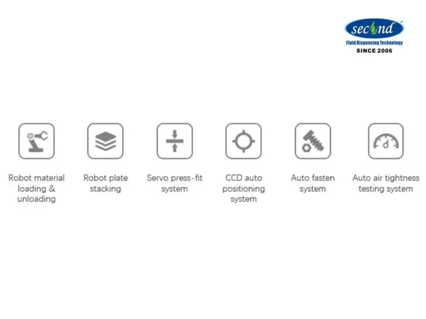 The design of the system stacking line aims to develop a fully automatic assembly line for stacking and assembling PEM hydrogen fuel cell battery stacks. The loading and unloading of materials in this line is realized by robots, stack end plates, current collector plates, bipolar plates, etc. The stacking of materials is completed by the robot, the high-precision servo press ensures the precise pressure of the stack, the visual alignment system ensures the accuracy, the stack is automatically tightened, and the multi-directional air tightness test is performed on the stack by the flow method.