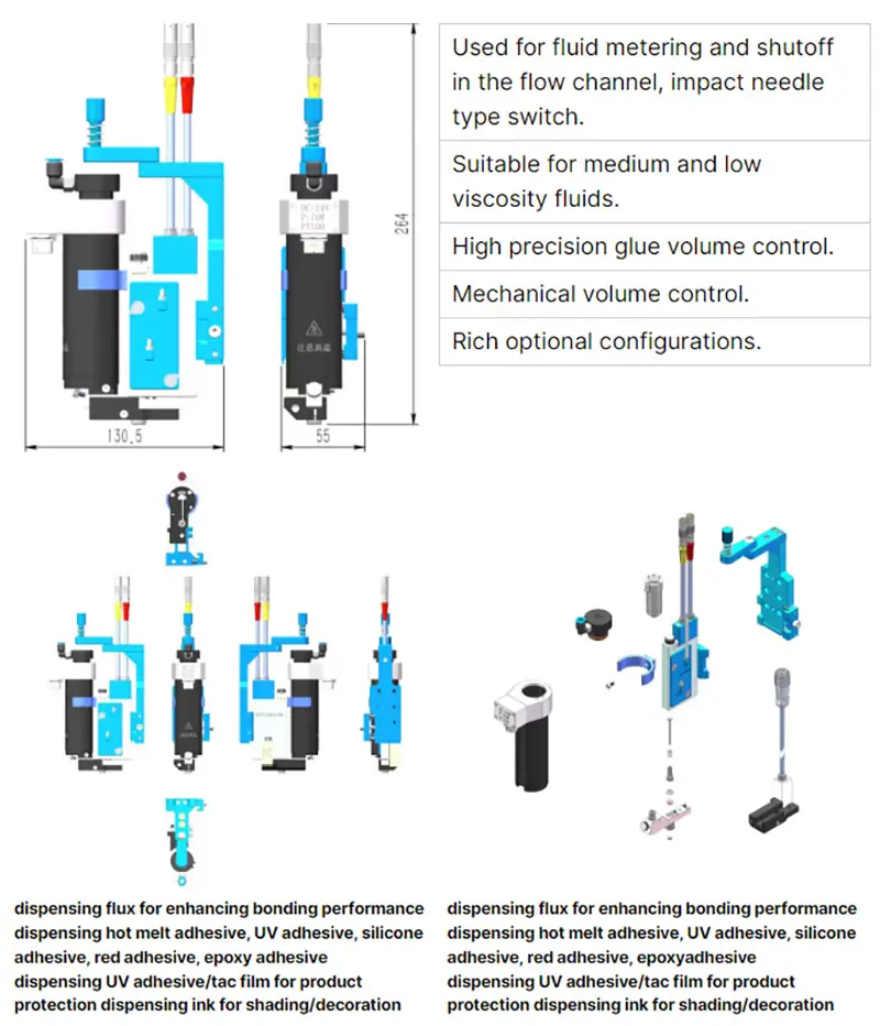 The F-P series piezoelectric injection valve is a single-component volumetric metering valve. Its application scenarios are almost the same as those of pneumatic injection valves, but it uses piezoelectric drive. Compared with pneumatic injection valves, it has a higher dispensing rate and higher glue consistency, and can achieve a smaller amount of glue dispensing! It is widely used in a variety of high-precision dispensing occasions!