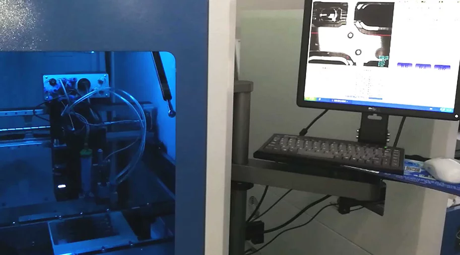 Smart high precision automated adhesive material dispensing machine with inline conveying system.