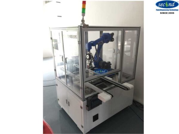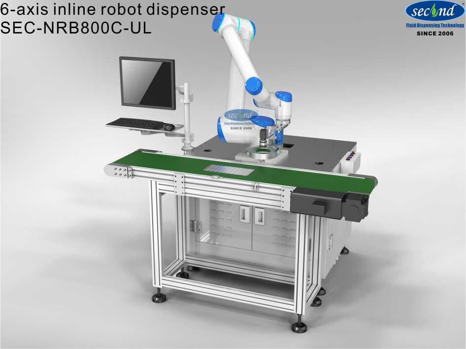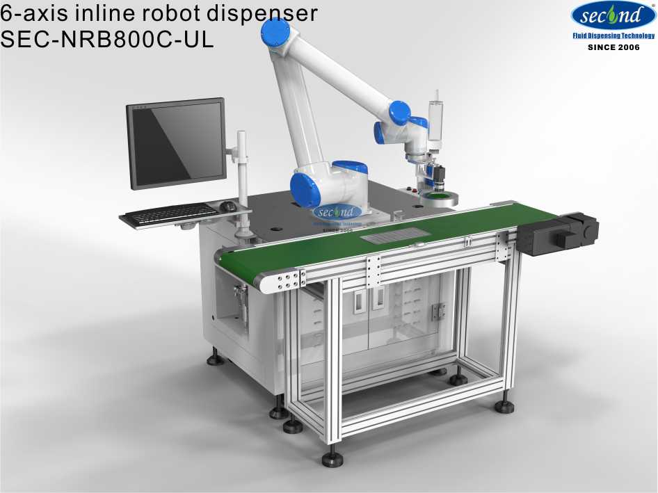 This is automated industrial adhesive material dispensing cobot works with a conveyor and equips with smart-visual camera that allows to automatic scan and dispensing SEC-NBR800CT-UL
