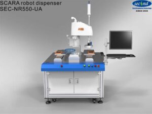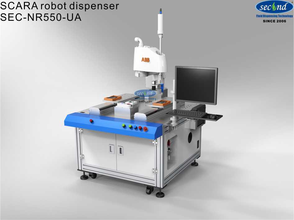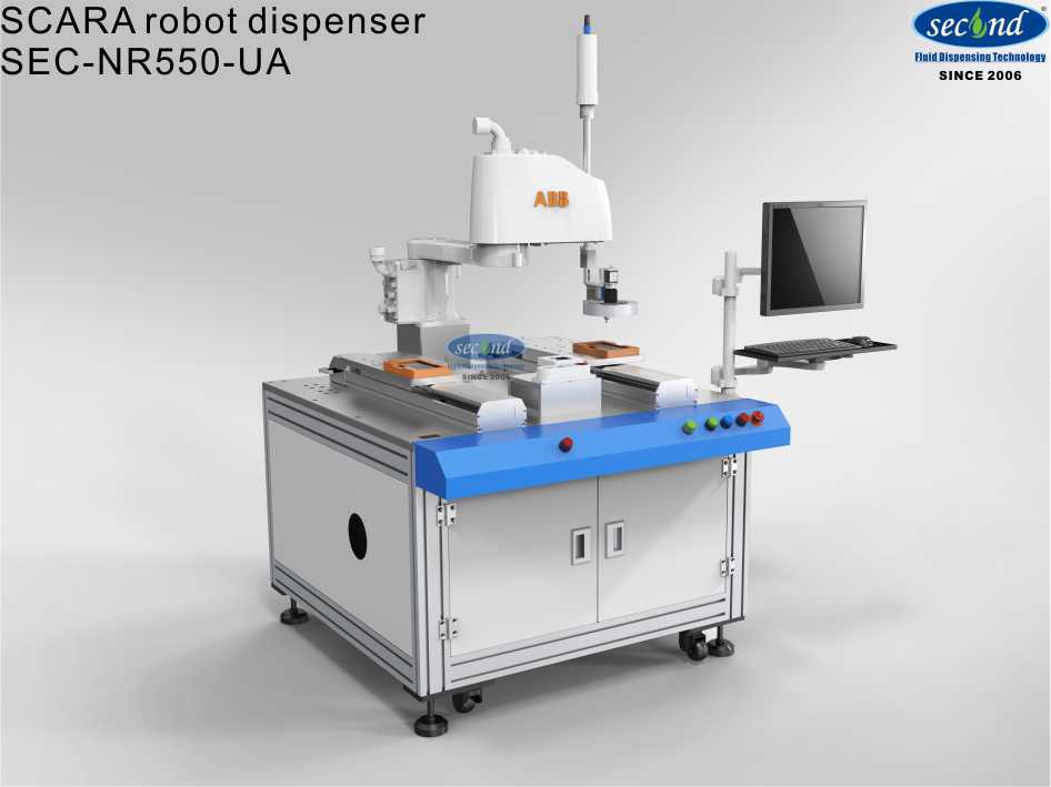 This is automated industrial adhesive material dispensing robot works with two working shuttles dispensing Scara?SEC-NR550-UA