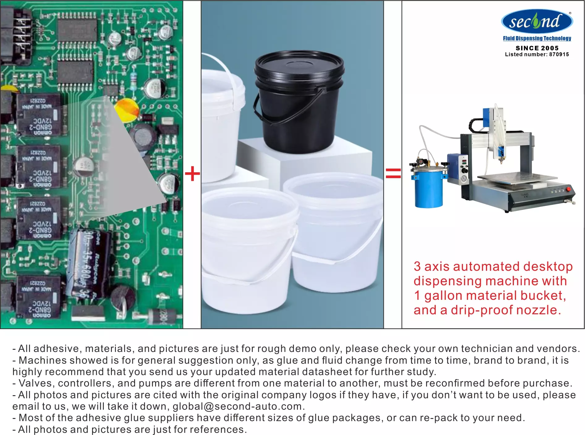 This is an industrial 1.5 gallons fluid, adhesive dispensing machine. The machine pairs with a 1.5 gallons material feeding tank, and a suck-back valve. It is suitable for low to medium viscosity fluids or adhesives dispensing. This is professional, heavy-duty industrial adhesive fluid, glue automated desktop dispensing machine.