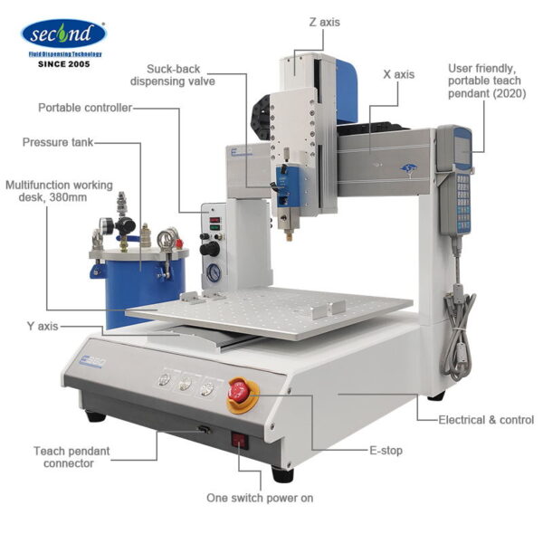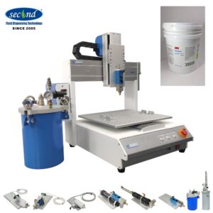 This is an industrial 1.5 gallons fluid, adhesive dispensing machine. The machine pairs with a 1.5 gallons material feeding tank, and a suck-back valve. It is suitable for low to medium viscosity fluids or adhesives dispensing. This is professional, heavy-duty industrial adhesive fluid, glue automated desktop dispensing machine.
